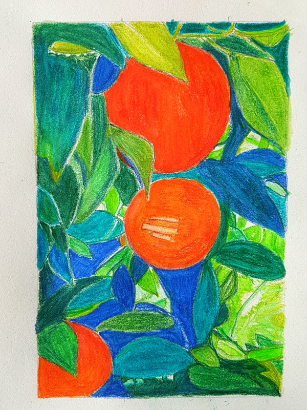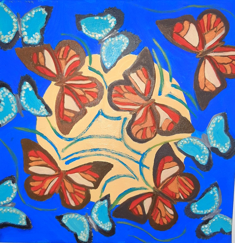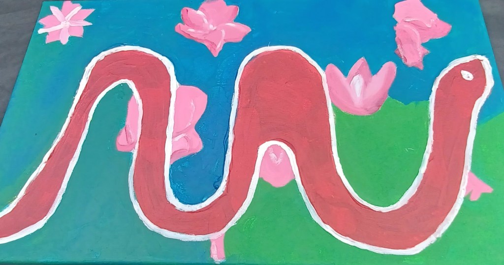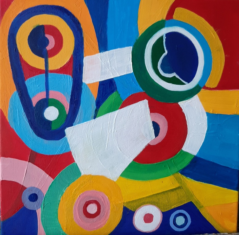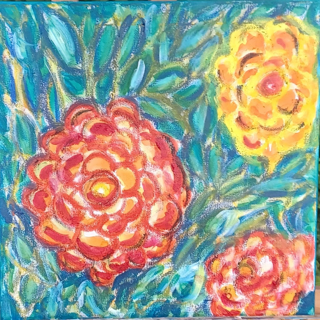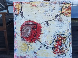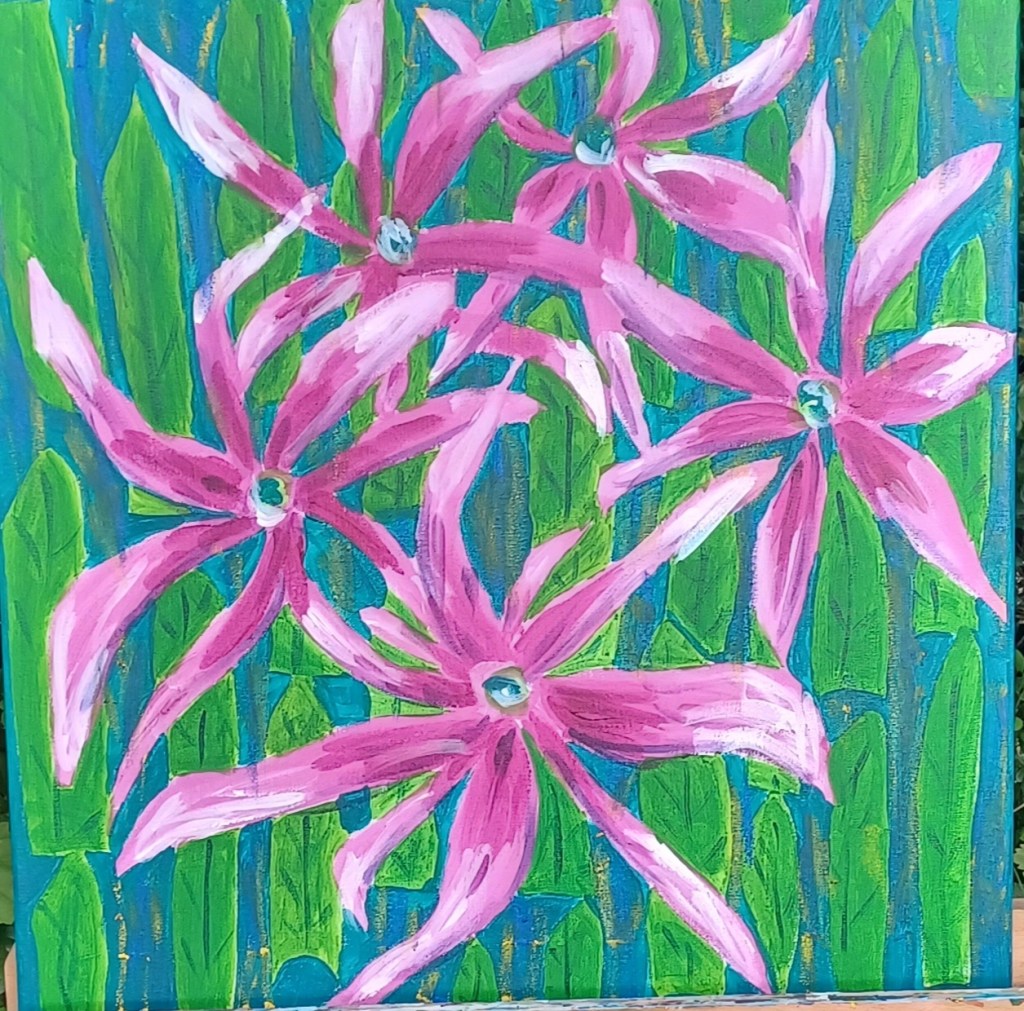 Blüten, 8/ 2023 ,Acryl auf Leinwand und Oilstick, 50 x 50 cm, inspiriert von Rose und Blutweiderich im Garten