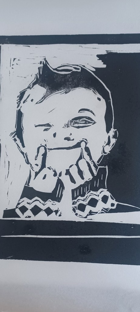Linoldruck- “smile” zur Ausstellung in der Citygalerie “Kirschner. Holzschnitte”